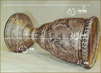 The chalice is in very good condition; elements of coral remain in the inner bowl and along delicate unfinished portions of the restored relief cleaning. The chalice, itself, was discovered off the coast of Florida. We have been contacted regarding a bill of lading record which may explain the chalice's port of origin as well as intended destination and historical basis. This website includes a few pages which review the prominent wind and waters concepts found on the chalice and provide general information on Da Vinci's use of these within the design. |
