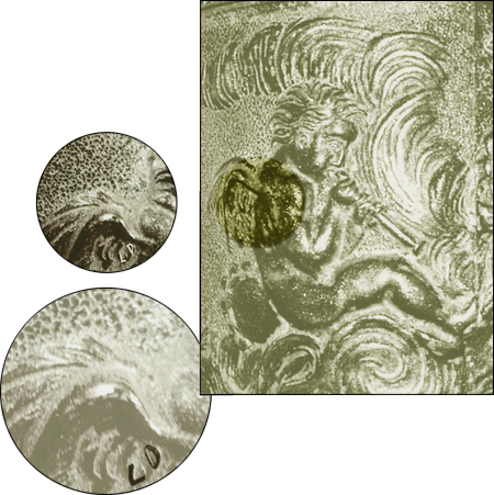 | SHOWN: HIGHLIGHT OF CITED TRUMPETER-ANGEL ALONG WITH LARGER VIEWS OF "LD" INITIALS UNDER THE ANGEL'S WING ADDITIONAL RESEARCH REGARDING THIS PARTICLUAR TRUMPETER-ANGEL AND THE "SEASHELL" NOTIF UNDER THE ANGEL-WING CAN BE FOUND HERE. |